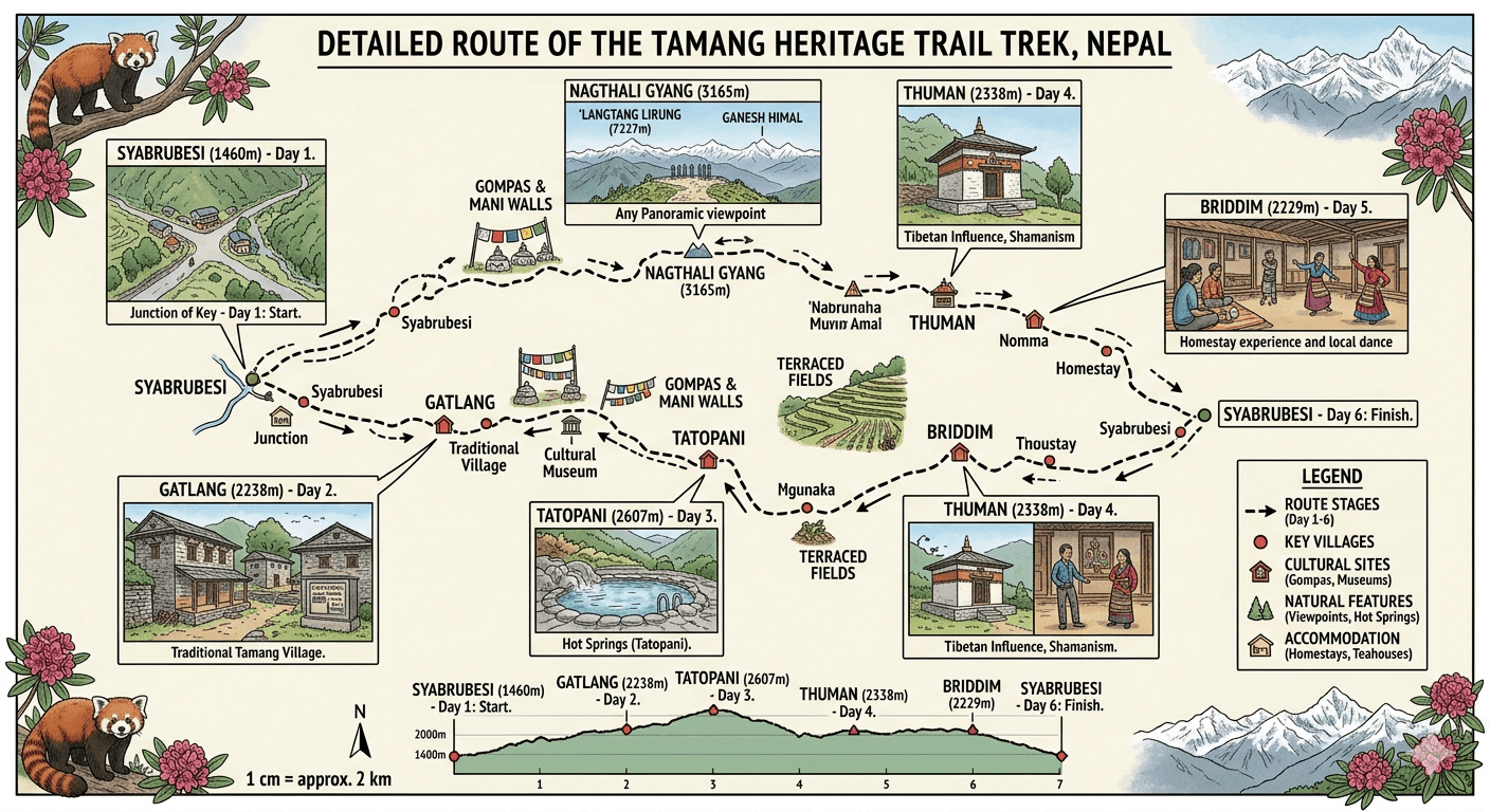 Tamang Heritage Trail is a north-central remote village in Nepal. This is one of the famous trekking routes and natural environment in the north-central of Nepal. It is situated 85 kilometers north of the capital of Nepal (Kathmandu), bordered by south-west of China (Tibet), it lies within its Langtang National Park and covers about 1,700-kilometer squares with a wide variety of climatic zones from subtropical to alpine. Hence, the park is very rich in geographical, climate, flora, and fauna diversities. Thus, in the region about 30% of the forest of Oak, maple, pine, and Rhododendron trees, and also yaks, blue sheep, Himalayan Tahr, Black Bears, snow leopards, and red pandas take shelter there.